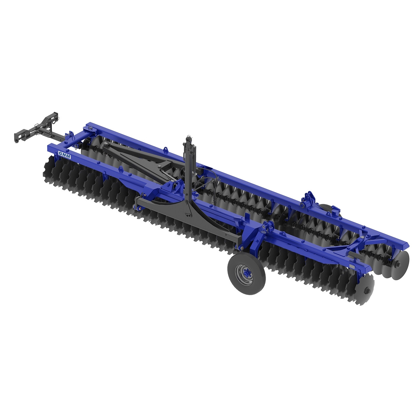 A GNM possui um eficiente sistema de rodagem, permitindo transitar por lugares estreitos e distantes, com rapidez e segurança. Estrutura resistente, regulagem simples, fácil operação e manutenção reduzida, com maior eficiência nos serviços de nivelamento e incorporação de herbicidas. Discos recortados na seção dianteira e lisos na traseira, com menor diâmetro nas extremidades. Todos os modelos podem ser equipados com cilindro hidráulico para abertura e fechamento da grade.