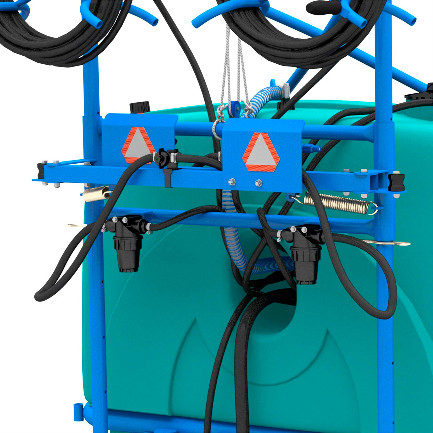 Pulverizador manual com tanque de 600 litros, bomba JP-75 litros/min, barramento manual de 2.20 metros, faixa de aplicação 10 metros, bicos pecuário, comando manual 6 seções, kit com duas pistolas e enroladores giratórios com 25 metros de mangueira cada, lava frasco na tampa do tanque, filtro principal com válvula, agitador hidráulico de calda e reservatório de água limpa.